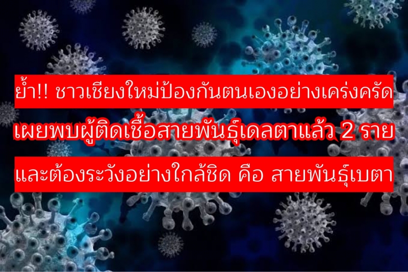 | • เชียงใหม่เผยพบผู้ติดเชื้อสายพันธุ์เดลตาแล้ว 2 ราย และต้องระวังอย่างใกล้ชิดอีก 1 สายพันธุ์ คือ สายพันธุ์เบตา จากประเทศแอฟริกาใต้ ย้ำต้องป้องกันตนเองอย่างเคร่งครัด |