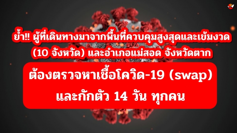 เชียงใหม่ ยกมาตรการควบคุมผู้เดินทางจากพื้นที่ควบคุมสูงสุดและเข้มงวด 10 จังหวัด และแม่สอด จ.ตาก ต้องตรวจหาเชื้อโควิด-19 (swap) และกักตัว 14 วัน ทุกคน