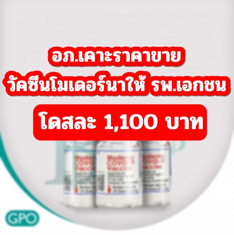 อภ.เคาะราคาขายวัคซีนโมเดอร์นาให้ รพ.เอกชน โดสละ 1,100 บาท โดยจะนำเข้ามาช่วงไตรมาส 4/2564 จำนวน 3.9 ล้านโดส และไตรมาสที่ 1/2565 จำนวน 1.1 ล้านโดส