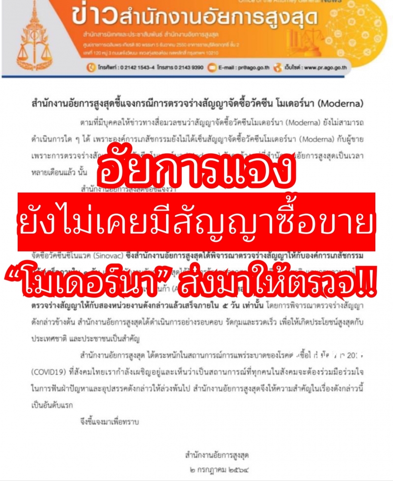 1.ข่าวดังกล่าวไม่มีมูลความจริง เพราะไม่เคยมีหน่วยงานใดหรือองค์กรใดส่งร่างสัญญาเกี่ยวกับการจัดซื้อวัคซีนโมเดอร์นา (Moderna) ให้กับสำนักงานอัยการสูงสุดพิจารณาตรวจร่างแต่อย่างใด