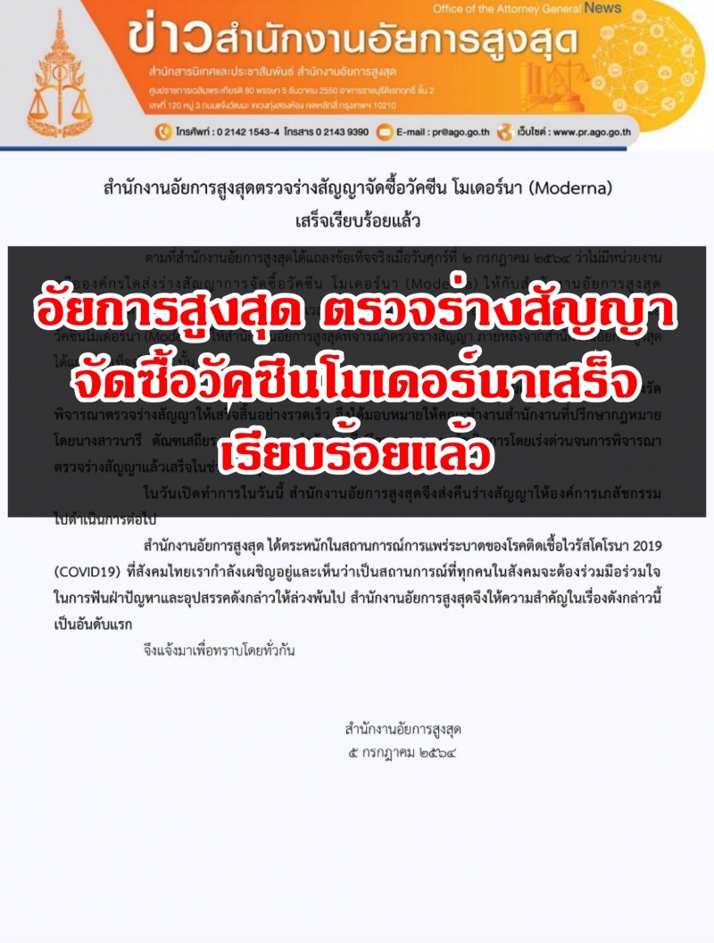 | • อัยการสูงสุด ตรวจร่างสัญญาจัดซื้อวัคซีนโมเดอร์นาเสร็จเรียบร้อยแล้ว |
