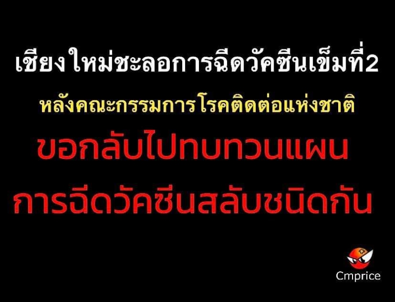 จังหวัดเชียงใหม่ ชะลอการให้บริการฉีดวัคซีนเข็มที่ 2 ภายหลังคณะกรรมการโรคติดต่อแห่งชาติ ขอกลับไปทบทวนแผนการฉีดวัคซีนสลับชนิดกัน ด้าน WHO ไม่ได้มีการห้ามให้ฉีดวัคซีนต่างชนิดกัน แต่ต้องเป็นการตัดสินใจของบุคลากรทางการแพทย์เท่านั้น