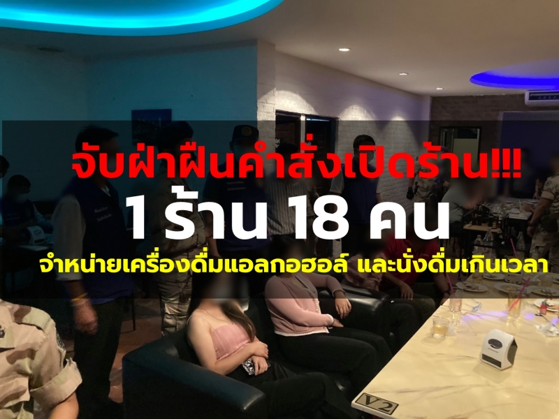 จับได้อีก 1 ร้าน 18 คน ฝ่าฝืนคำสั่งเปิดร้าน จำหน่ายเครื่องดื่มแอลกอฮอล์ และนั่งดื่มเกินเวลาอนุญาต