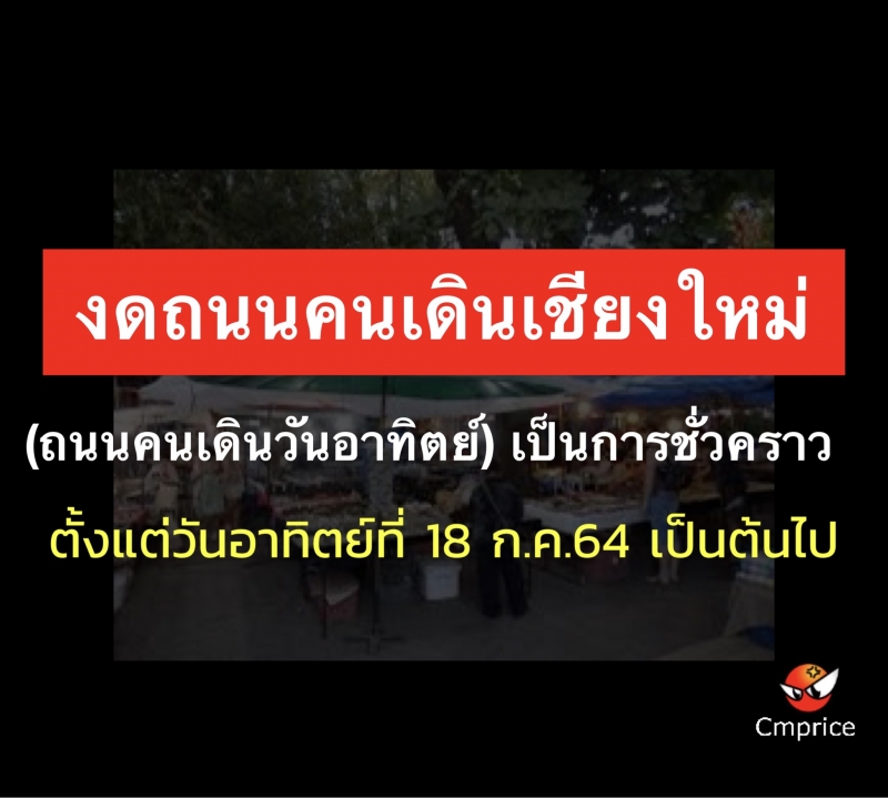 ประชาสัมพันธ์ด่วน! ขอแจ้งงดการจัดถนนคนเดินเชียงใหม่ (ถนนคนเดินวันอาทิตย์) เป็นการชั่วคราว ตั้งแต่วันอาทิตย์ที่ 18 กรกฎาคม 2564 เป็นต้นไป