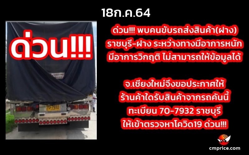 คณะกรรมการโรคติดต่อจังหวัดเชียงใหม่ ประกาศแจ้งเตือนให้พนักงานร้านค้าที่รับสินค้าจากรถขนส่งสินค้า สีน้ำเงิน หมายเลขทะเบียน 70-7932 ราชบุรี ให้รีบเข้ารับการตรวจหาเชื้อโควิด-19 ได้ที่โรงพยาบาลทุกแห่งโดยด่วน