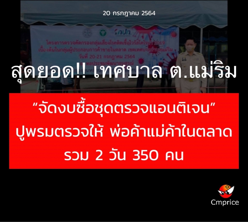 วันนี้ 20ก.ค.64 เทศบาลตำบลแม่ริมได้ใช้งบซื้อชุดตรวจแอนติเจนมาปูพรมตรวจให้ พ่อค้าแม่ค้าในตลาด รวม 2 วัน 350 คน เพราะทางเจ้าหน้าที่ ต้องหาคนผู้ติดเชื้อให้เจอโดยเร็ว และแยกผู้ติดเชื้อออกจากชุมชนให้เร็วที่สุด เพราะมีหลายกรณี ที่คนติดเชื้อยังไม่รู้ตัว