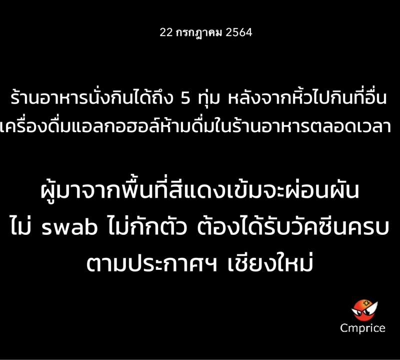 ร้านอาหารนั่งกินได้ถึง 5 ทุ่ม หลังจากหิ้วไปกินที่อื่น เครื่องดื่มแอลกอฮอล์ห้ามดื่มในร้านอาหารตลอดเวลา ผู้มาจากพื้นที่สีแดงเข้มจะผ่อนผันไม่ swab ไม่กักตัว ต้องได้รับวัคซีนครบตามประกาศฯ เชียงใหม่