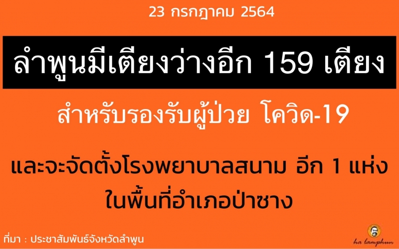 ศูนย์บริหารสถานการณ์การแพร่ระบาดของโรคติดเชื้อไวรัสโคโรนา 2019 (โควิด-19) จังหวัดลำพูน แถลงสถานการณ์การแพร่ระบาดในพื้นที่จังหวัดลำพูน โดยมี แพทย์หญิงภาวิณี เอี่ยมจันทน์ ผู้อำนวยการโรงพยาบาลลำพูน พร้อมด้วย นายแพทย์สันติ วงศ์ฝั้น ผู้อานวยการโรงพยาบาลแม่ทา ร่วมแถลงข่าว ณ ศาลาประชาคม ศาลากลางจังหวัดลำพูน โดยสถานการณ์เตียงที่รองรับผู้ป่วยโควิด-19 ในขณะนี้ ยังมีเตียงสำหรับการรองรับผู้ป่วยอีก จำนวน 159 เตียง แต่เนื่องจากในปัจจุบันตรวจพบ พบผู้ป่วยอย่างต่อเนื่อง จังหวัดลำพูนจึงจะเตรียมความพร้อม โดยจะจัดตั้งโรงพยาบาลสนาม อีก 1 แห่งในพื้นที่อำเภอป่าซาง ซึ่งจะมีการสำรวจความพร้อมของสถานที่อีกครั้งหนึ่ง