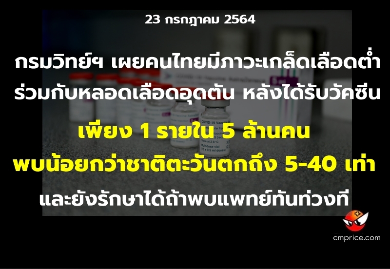 กรมวิทย์ฯ เผยคนไทยมีภาวะเกล็ดเลือดต่ำร่วมกับหลอดเลือดอุดตัน หลังได้รับวัคซีนเพียง 1 รายใน 5 ล้านคน พบน้อยกว่าชาติตะวันตกถึง 5-40 เท่า และยังรักษาได้ถ้าพบแพทย์ทันท่วงที