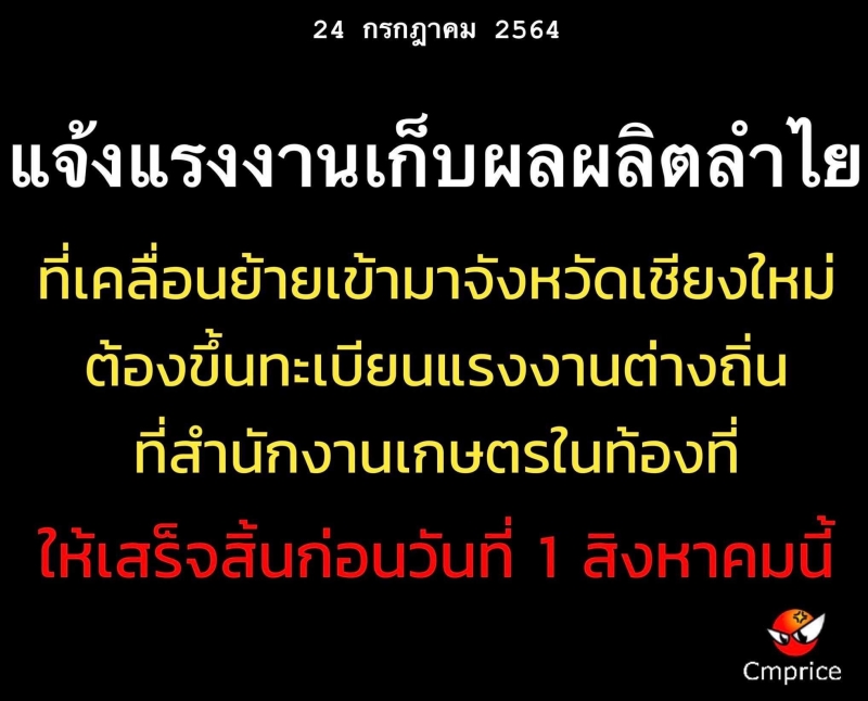 คณะกรรมการโรคติดต่อจังหวัดเชียงใหม่ ออกคำสั่งแจ้งให้แรงงานเก็บผลผลิตลำไยนอกเขตจังหวัดเชียงใหม่ ที่มีการเคลื่อนย้ายเข้ามา ต้องขึ้นทะเบียนแรงงานต่างถิ่น ณ สำนักงานเกษตรจังหวัด หรือสำนักงานเกษตรอำเภอ ให้เสร็จสิ้นก่อนวันที่ 1 สิงหาคม 2564 ฝ่าฝืนปรับสูงสุด 20,000 บาท