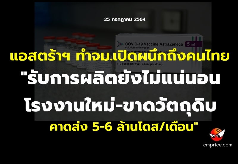 แอสตร้าฯ ทำจม.เปิดผนึกถึงคนไทย "รับการผลิตยังไม่แน่นอน โรงงานใหม่-ขาดวัตถุดิบ คาดส่ง 5-6 ล้านโดส/เดือน"