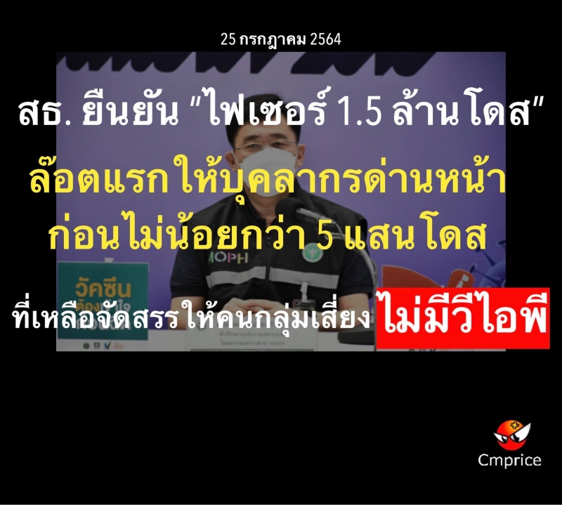 สธ. ยืนยัน “ไฟเซอร์ 1.5 ล้านโดส”ล๊อตแรกให้บุคลากรด่านหน้าก่อนไม่น้อยกว่า 5 แสนโดส ที่เหลือจัดสรรให้คนกลุ่มเสี่ยง ไม่มีวีไอพี