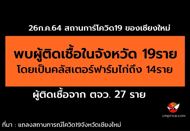 | • เชียงใหม่พบผู้ติดเชื้อในจังหวัด 19ราย คลัสเตอร์ฟาร์มไก่ยังลาม แต่ยังคงต้องเฝ้าระวังสูง |