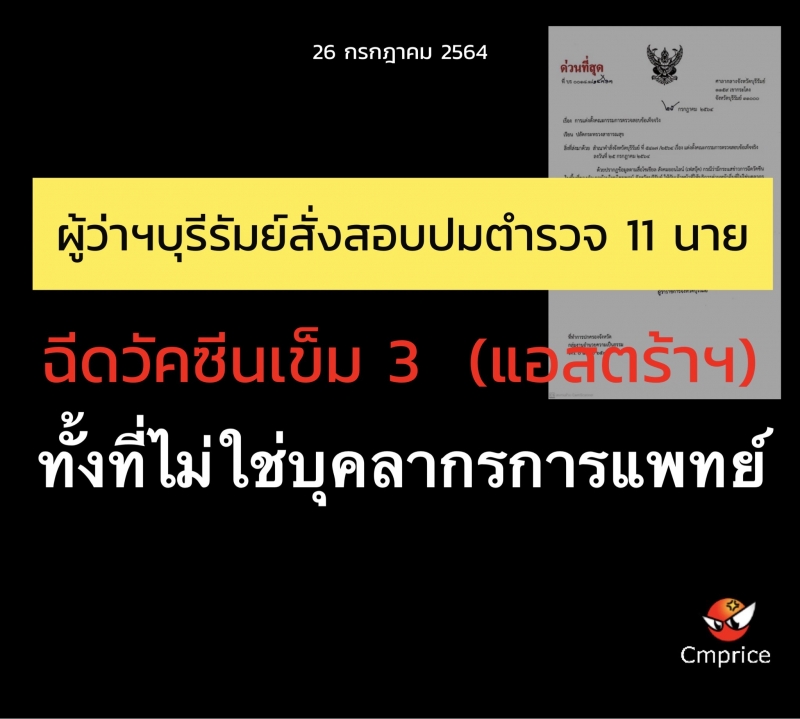 ผู้ว่าบุรีรัมย์สั่งสอบปมตำรวจฉีดวัคซีนเข็ม 3 ทั้งที่ไม่ใช่บุคลากรการแพทย์