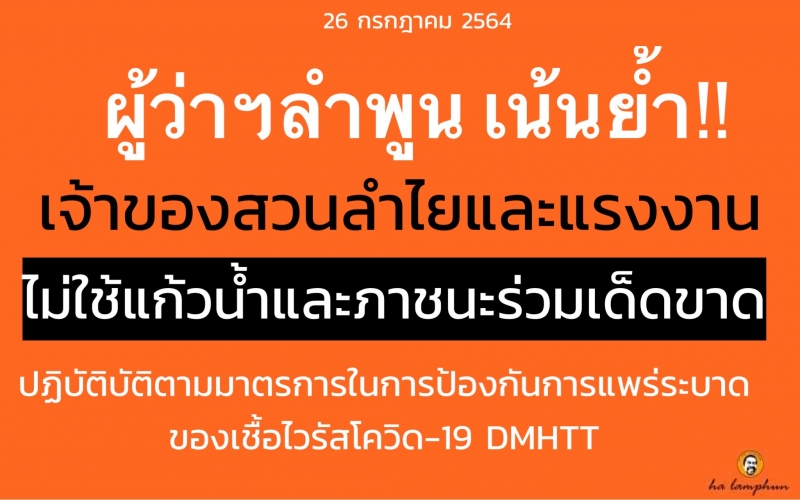 ผู้ว่าฯลำพูน เน้นย้ำ!!ให้เจ้าของสวนลำไยและแรงงาน ปฏิบัติบัติตามมาตรการในการป้องกันการแพร่ระบาดของเชื้อไวรัสโควิด-19 ( DMHTT ) ย้ำชัด..ไม่ใช้ภาชนะเดียวกัน โดยเฉพาะอย่างยิ่งห้ามใช้แก้วน้ำร่วมกันอย่างเด็ดขาด