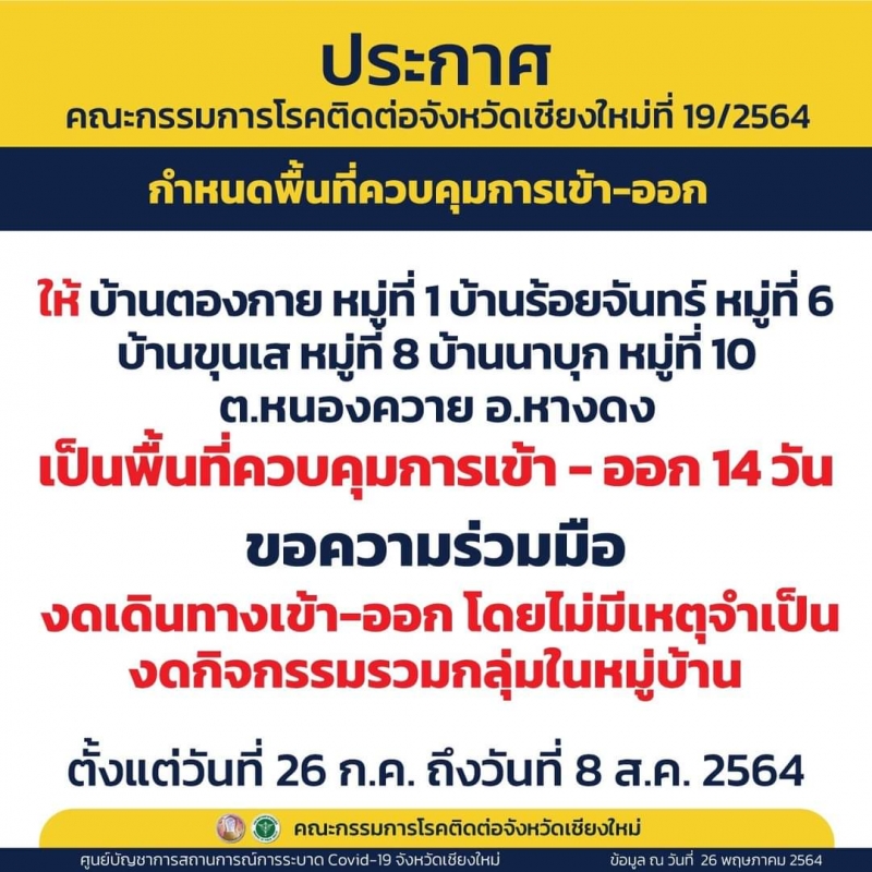 ให้ทางอำเภอหางดง กำหนดพื้นที่ควบคุมการเข้า - ออก จำนวน 4 หมู่บ้าน ได้แก่ บ้านตองกาย หมู่ที่ 1 , บ้านร้อยจันทร์ หมู่ที่ 6 , บ้านขุนเส หมู่ที่ 8 และบ้านนาบุก หมู่ที่ 10 ตำบลหนองควาย อำเภอหางดง จังหวัดเชียงใหม่ โดย ขอความร่วมมือให้ประชาชนในพื้นที่ และประชาชนในจังหวัดเชียงใหม่ งดการเดินทางเข้า-ออก ในเขตพื้นที่ 4 หมู่บ้าน ดังกล่าวโดยไม่มีเหตุจำเป็น และงดการทำกิจกรรมรวมกลุ่มกันทุกประเภท เพื่อลดความเสี่ยงต่อการสัมผัสโรค และเป็นการป้องกันการแพร่ระบาดของโรคติดเชื้อไม่ให้เพิ่มขึ้นอีก พร้อมทั้งให้ศูนย์ปฏิบัติการควบคุมโรคอำเภอหางดง ดำเนินการจัดระเบียบ ระบบ และควบคุมติดตามผู้ที่เดินทางเข้า - ออกหมู่บ้าน โดย ให้นายอำเภอหางดง ในฐานะหัวหน้าศูนย์ปฏิบัติการควบคุมโรคอำเภอหางดง และเจ้าพนักงานควบคุมโรคติดต่ออำเภอหางดง คอยกำกับและควบคุมการปฏิบัติให้เป็นไปด้วยความเรียบร้อย โดยเริ่มตั้งแต่วันที่ 26 กรกฎาคม 2564 ที่ผ่านมา ไปถึงวันที่ 8 สิงหาคม 2564