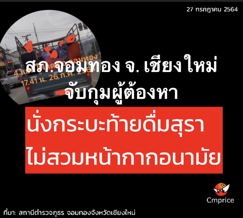 สภ.จอมทอง จ. เชียงใหม่จับกุมผู้ต้องหานั่งกระบะท้ายดื่มสุราและไม่สวมหน้ากากอนามัย