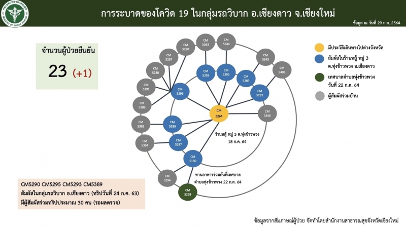 ผู้ติดเชื้อรายใหม่ 65 รายในวันนี้ เป็นผู้ติดเชื้อในจังหวัดจำนวน 29 ราย ซึ่งมาจากคลัสเตอร์ฟาร์มคัดแยกไข่ไก่ 2 ราย คลัสเตอร์กลุ่มรถวิบาก 1 ราย สำนักงานที่ดิน อำเภอพร้าว 3 ราย บริษัทนิ่มซี่เส็ง สาขาท่าลี่ อำเภอจอมทอง 3 ราย โกดังมะเขือเทศ อำเภอฮอด 2 ราย โดยในวันนี้พบการติดเชื้อจากการสัมผัสในครอบครัวจำนวนหลายราย ซึ่งเป็นครอบครัวผู้ขายของในตลาดนัดสันกำแพง 4 ราย และครอบครัวตำบลสะลวง อำเภอแม่ริม 2 ราย ซึ่งทั้ง 2 กรณี อยู่ระหว่างการสอบสวนแหล่งสัมผัสโรค ส่วนอีก 2 ครอบครัว เป็นการติดเชื้อต่อมาจากผู้ที่เดินทางกลับมาจากกรุงเทพฯ แต่ไม่เคร่งครัดในการกักตัว ครอบครัวแรกที่ตำบลสันผีเสื้อ อำเภอเมือง พบผู้มีผลบวก 4 ราย และอีกครอบครัวที่ตำบลมะลิกา อำเภอแม่อาย พบผู้มีผลบวก 4 ราย เช่นกัน