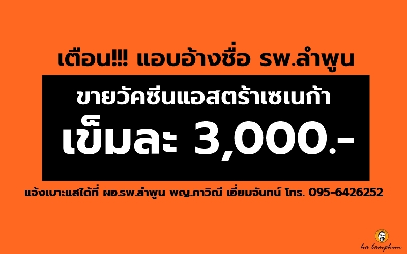 รพ.ลำพูนแจ้งเตือน!! พบคนอ้างขายวัคซีนAZ เข็มละ3,000.- ย้ำ!!วัคซีนไม่มีขาย!!!!