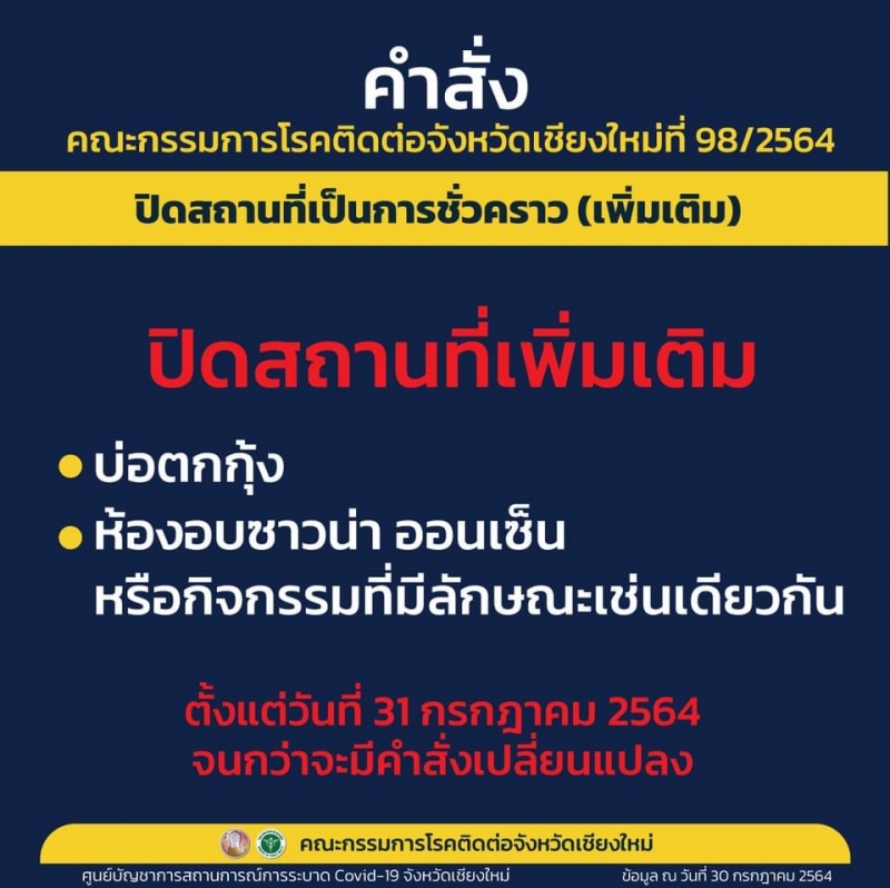 นายกนก ศรีวิชัยนันท์ ปลัดจังหวัดเชียงใหม่ เปิดเผยในการแถลงข่าวของศูนย์บัญชาการสถานการณ์การระบาดโรคโควิด-19 จังหวัดเชียงใหม่ ในวันนี้ (30 ก.ค. 64) ว่า ตามที่คณะกรรมการโรคติดต่อจังหวัดเชียงใหม่ ได้ออกคำสั่งคณะกรรมการโรคติดต่อจังหวัดเชียงใหม่ ที่ 92/2564 เรื่อง ปิดสถานที่เป็นการชั่วคราว ลงวันที่ 25 กรกฎาคม 2564 นั้น เนื่องจากสถานการณ์การแพร่ระบาดของโรคโควิด–19 ยังคงเพิ่มขึ้นอย่างต่อเนื่อง ดังนั้น เพื่อให้การควบคุมและเฝ้าระวังการแพร่ระบาดของโรคโควิด–19 ในพื้นที่จังหวัดเชียงใหม่ เป็นไปอย่างมีประสิทธิภาพสามารถควบคุมโรคให้สงบโดยเร็ว คณะกรรมการโรคติดต่อจังหวัดเชียงใหม่ จึงมีมติเห็นควรปิดสถานที่เพิ่มเติม ตามคำสั่งคณะกรรมการโรคติดต่อจังหวัดเชียงใหม่ ที่ 98/2564 โดยให้ปิดสถานที่เพิ่มเติม ประกอบด้วย บ่อตกกุ้ง และห้องอบซาวน่า ออนเซ็น หรือกิจกรรมอย่างอื่นใดที่มีลักษณะเช่นเดียวกัน ทั้งนี้หากพบว่า บรรดาคำสั่งหรือประกาศของคณะกรรมการโรคติดต่อจังหวัดเชียงใหม่ฉบับใดมีข้อความที่ขัดหรือแย้งกับคำสั่งฉบับนี้ ให้ถือปฏิบัติตามคำสั่งฉบับนี้เป็นหลัก ในกรณีมีปัญหาที่จะต้องตีความหรือวินิจฉัยเกี่ยวกับข้อปฏิบัติตามคำสั่งนี้ ให้ตีความหรือวินิจฉัยโดยที่ประชุมคณะกรรมการโรคติดต่อจังหวัดเชียงใหม่เท่านั้น