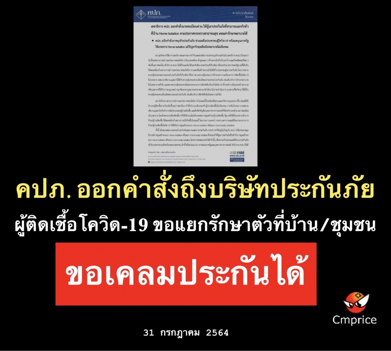 | • คปภ. ออกคำสั่งถึงบริษัทประกันภัย ผู้ติดเชื้อโควิด-19 ขอแยกรักษาตัวที่บ้าน/ชุมชน ขอเคลมประกันได้ |