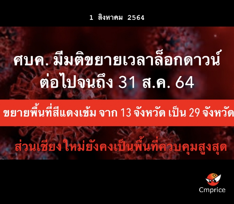 | • ศบค. มีมติขยายเวลาล็อกดาวน์ต่อไปจนถึง 31 ส.ค. 64 ขยายพื้นที่สีแดงเข้ม จาก 13 จังหวัด เป็น 29 จังหวัด |