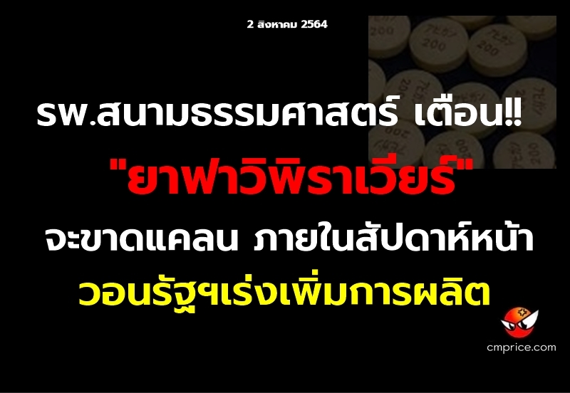 เพจโรงพยาบาลสนามธรรมศาสตร์เตือน ยาฟาวิพิราเวียร์กำลังจะหมดภายในสัปดาห์หน้า หากรัฐบาลไม่เร่งให้โรงงานผลิตยาของเอกชนที่มีมาตรฐานสูงในระดับเดียวกันเข้ามาช่วย