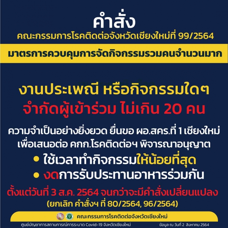 คณะกรรมการโรคติดต่อจังหวัดเชียงใหม่ ออกคำสั่งที่ 99/2564 เรื่อง มาตรการควบคุมการจัดกิจกรรมรวมคนจำนวนมาก จำกัดผู้เข้าร่วมกิจกรรมไม่เกิน 20 คน พร้อมขอความร่วมมือใช้เวลาจัดกิจกรรมให้น้อยที่สุด และงดการรับประทานอาหารร่วมกัน