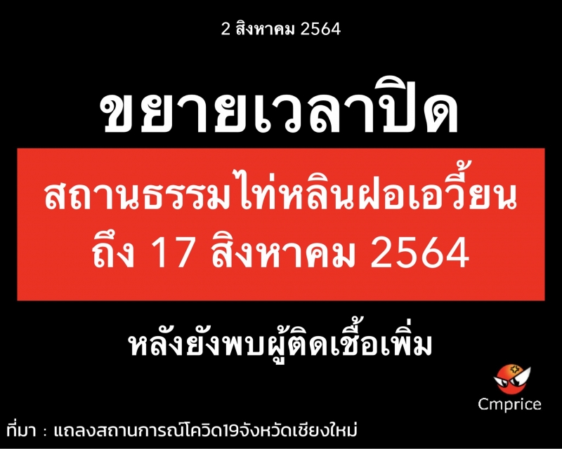 วันนี้ (2 ส.ค. 64) ที่ศูนย์บัญชาการสถานการณ์การระบาดโรค Covid-19 จังหวัดเชียงใหม่ นายกนก ศรีวิชัยนันท์ ปลัดจังหวัดเชียงใหม่ เปิดเผยว่า ตามที่คณะกรรมการโรคติดต่อจังหวัดเชียงใหม่ ได้ออกคำสั่งคณะกรรมการโรคติดต่อจังหวัดเชียงใหม่ ที่ 87/2564 ปิดสถานธรรมไท่หลินฝอเอวี้ยน ซึ่งตั้งอยู่เลขที่ 62 บ้านสันป่าเลียง หมู่ที่ 4 ตำบลหนองหอย อำเภอเมืองเชียงใหม่ จังหวัดเชียงใหม่ ตั้งแต่วันที่ 21 กรกฎาคม 2564 ถึงวันที่ 3 สิงหาคม 2564 นั้น