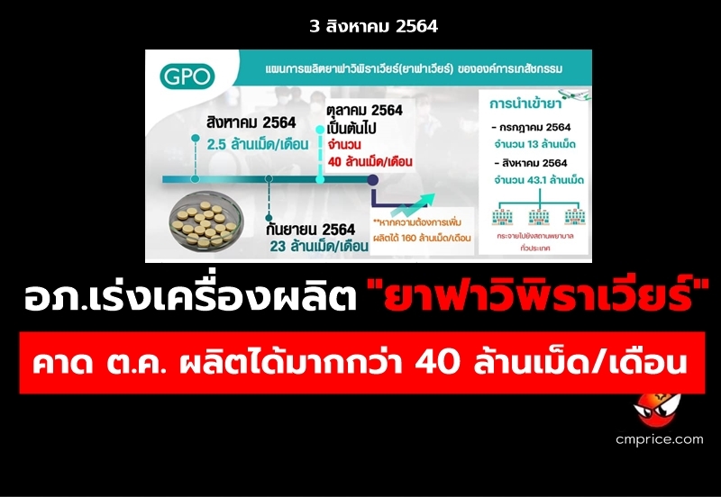 องค์การเภสัชกรรม เผยแผนขยายการผลิตยาฟาวิพิราเวียร์ได้มากกว่า 40 ล้านเม็ดต่อเดือนตั้งแต่ตุลาคมนี้ พร้อมเตรียมเปิดสายการผลิตที่ 5 โรงงานผลิตยาขององค์การเภสัชกรรมที่คลอง 10 อ.ธัญบุรี จ.ปทุมธานี ผลิตได้ถึง 2,000 ล้านเม็ดต่อปีหรือเดือนละไม่น้อยกว่า 160 ล้านเม็ดต่อเดือน