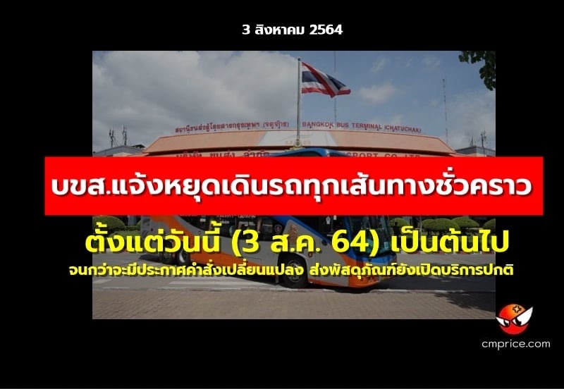 บขส.แจ้งหยุดเดินรถทุกเส้นทางชั่วคราว ตั้งแต่วันนี้ (3 ส.ค. 64) เป็นต้นไป จนกว่าจะมีประกาศคำสั่งเปลี่ยนแปลง ส่งพัสดุภัณฑ์ยังเปิดบริการปกติ