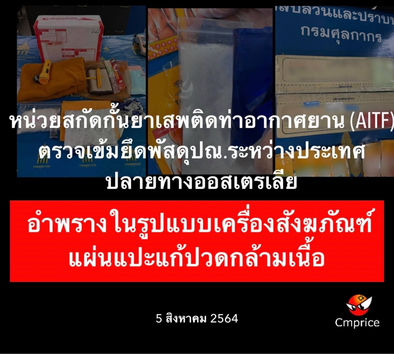 หน่วยสกัดกั้นยาเสพติดท่าอากาศยาน (AITF) ตรวจเข้มยึดพัสดุไปรษณีย์ระหว่างประเทศปลายทางออสเตรเลีย หลังอำพรางในรูปแบบเครื่องสังฆภัณฑ์ และแผ่นแปะแก้ปวดกล้ามเนื้อ หวังตบตาเจ้าหน้าที่