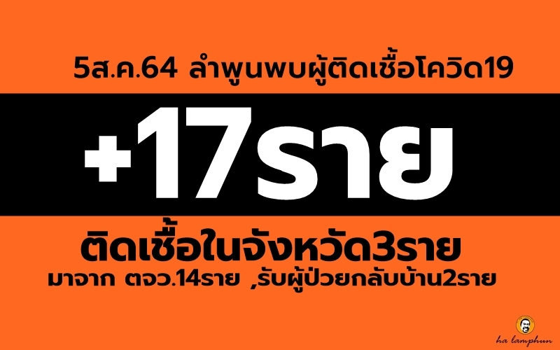 วันนี้ 5สิงหา64 จ.ลำพูน พบผู้ติดเชื้อรายใหม่จำนวน 17ราย เป็นการติดเชือในจังหวัด 3ราย มาจากต่างจังหวัด12ราย และ รับผู้ป่วยมารักษา 2ราย