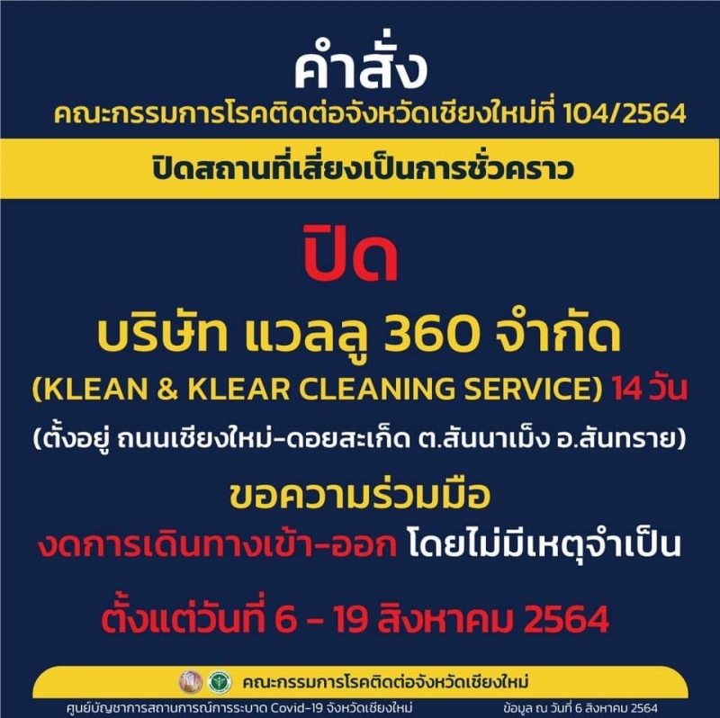คณะกรรมการโรคติดต่อจังหวัดเชียงใหม่ สั่งปิดบริษัท แวลลู 360 จำกัด (KLEAN & KLEAR CLEANING SERVICE) เป็นเวลา 14 วัน หลังพบผู้ติดเชื้อโควิด-19 พร้อมขอความร่วมมือประชาชนงดการเดินทางเข้าไปในบริษัทดังกล่าว โดยไม่มีเหตุจำเป็น