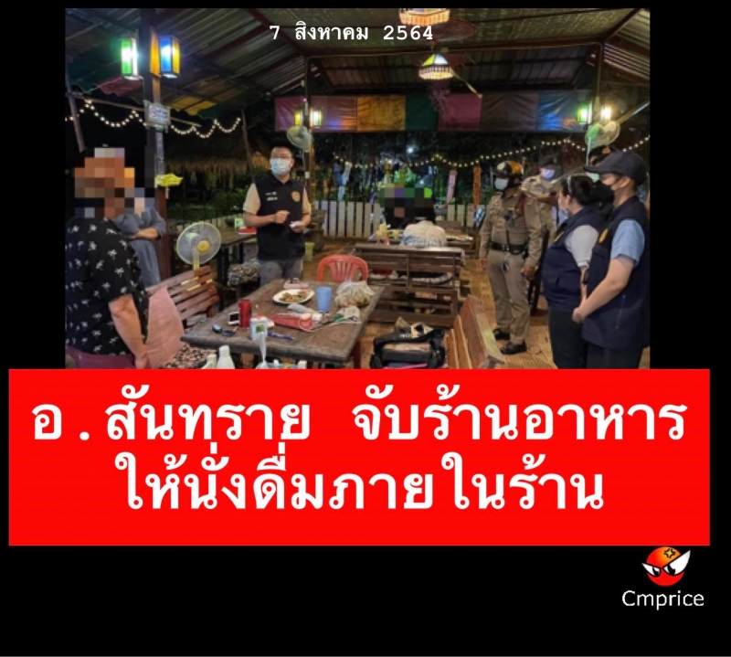 วันที่ 6 ส.ค. 64 ตั้งแต่เวลา 21.00 น. ศปก.อำเภอสันทราย โดยการอำนวยการของ นายศิวะ ธมิกานนท์ นายอำเภอสันทราย นายถนอม กุยแก้ว ปลัดอำเภอหัวหน้าฝ่ายบริหารงานปกครอง มอบหมายให้ นายนพดล ศรีสุข ปลัดอำเภอฝ่ายความมั่นคง พร้อมด้วย เจ้าหน้าที่ฝ่ายปกครอง, สมาชิก อส.อ.สันทราย ที่ 15 ทำการตรวจสอบร้านจำหน่ายอาหารและเครื่องดื่ม ชื่อร้านอาหารตั้งอยู่ใน ต.ป่าไผ่ อ.สันทราย ซึ่งเป็นการดำเนินการตามนโยบายของจังหวัดเชียงใหม่ในการเฝ้าระวัง ติดตาม ป้องกัน ตามมาตรการควบคุมโรคติดต่อไวรัสโคโรน่า 2019 หรือ โควิด-19