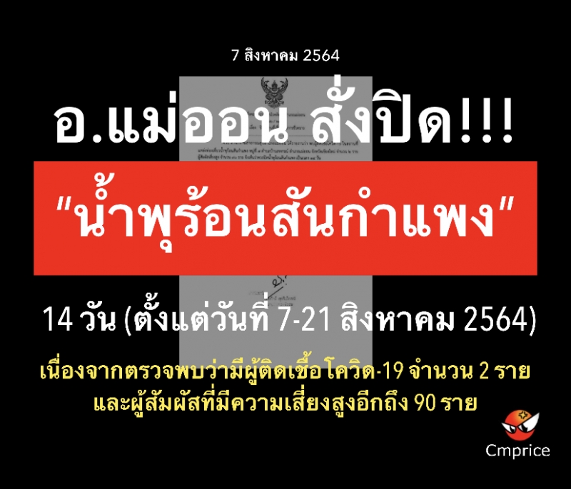 | • อ.แม่ออน สั่งปิด น้ําพุร้อนสันกําแพง 14 วัน ตั้งแต่วันที่ 7-21 สิงหาคม 2564 |