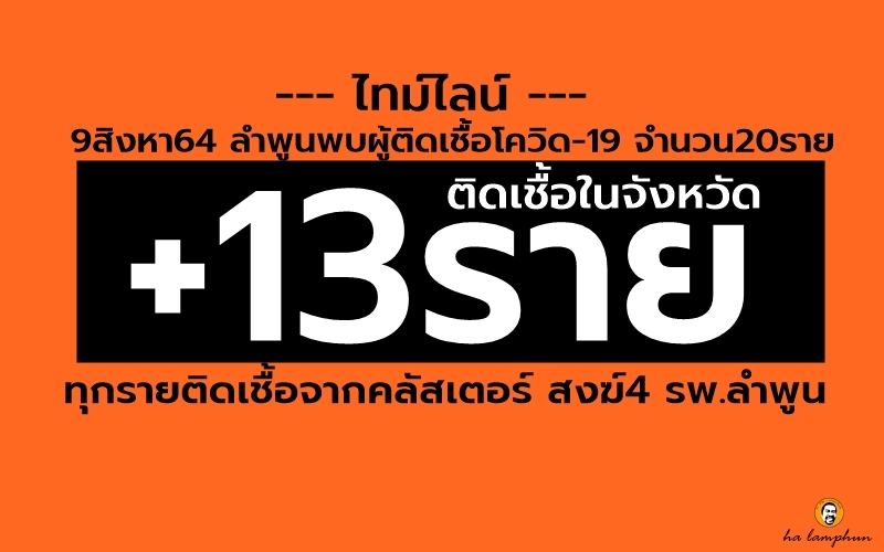 วันที่ 9 สิงหา 64 ลำพูน พบผู้ติดเชื้อรายใหม่จำนวน 20ราย เป็นการติดเชือในจังหวัด 13ราย มาจากจังหวัดเสี่ยง 6ราย โครงการรับคนลำพูนกลับบ้าน 1ราย