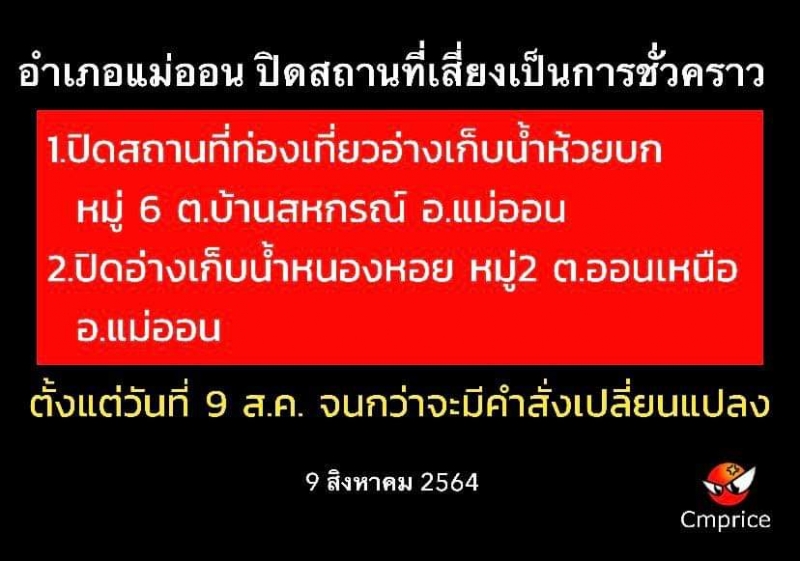 คำสั่งคณะกรรมการโรคติดต่ออำเภอแม่ออน 03/2564 เรื่องปิดสถานที่เสี่ยงเป็นการชั่วคราว