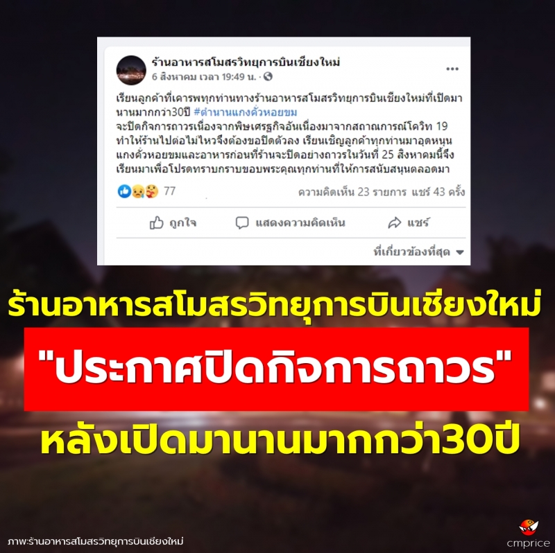 ร้านอาหารสโมสรวิทยุการบินเชียงใหม่"ประกาศปิดกิจการถาวร" หลังเปิดมานานมากกว่า30ปี