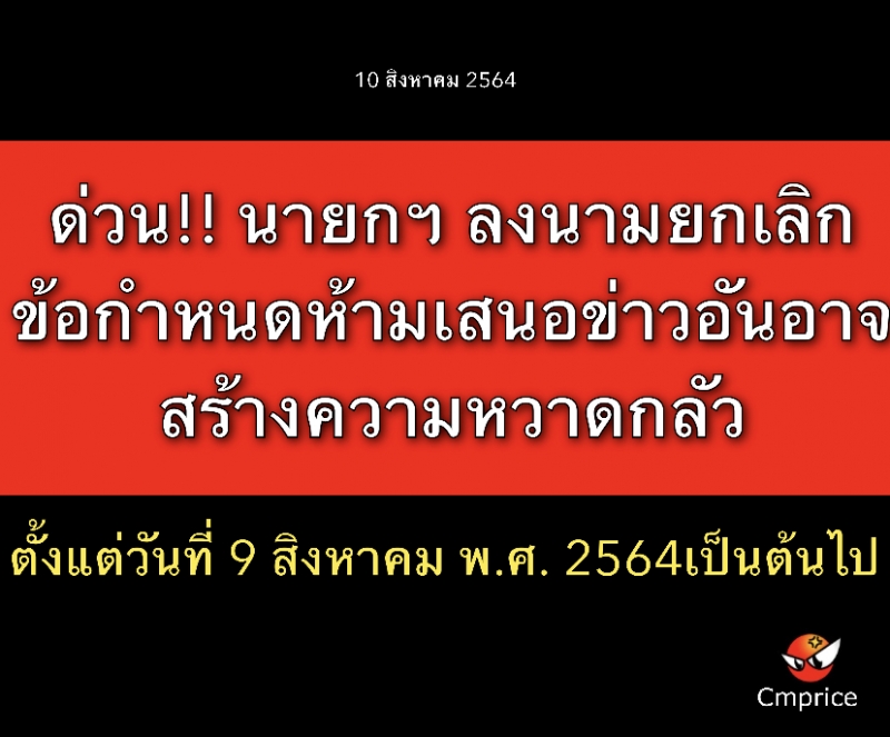 ด่วน!! นายกฯ ลงนามยกเลิกข้อกำหนดห้ามเสนอข่าวอันอาจสร้างความหวาดกลัว มีผล 9 ส.ค.64