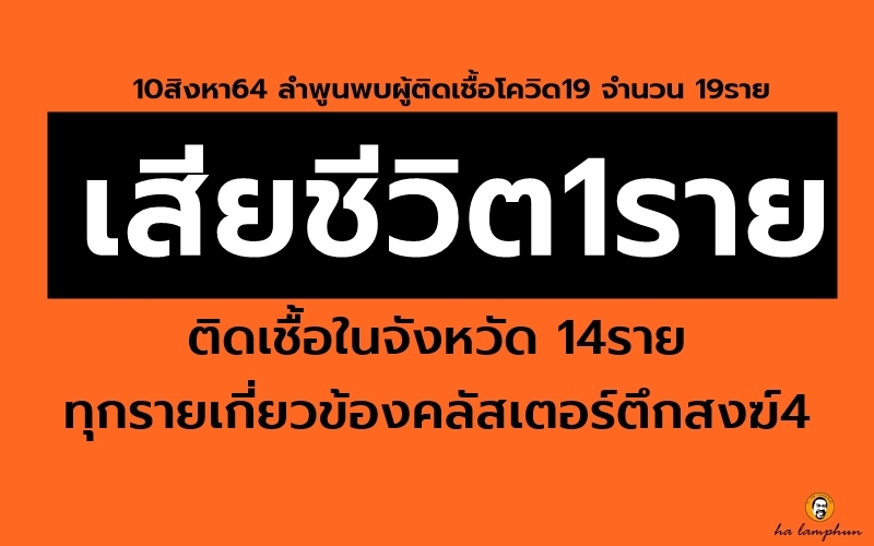 วันที่ 10 สิงหา 64 ลำพูน พบผู้ติดเชื้อรายใหม่จำนวน 19ราย เป็นการติดเชือในจังหวัด 14ราย มาจากจังหวัดเสี่ยง 2ราย  โครงการรับคนลำพูนกลับบ้าน 3ราย