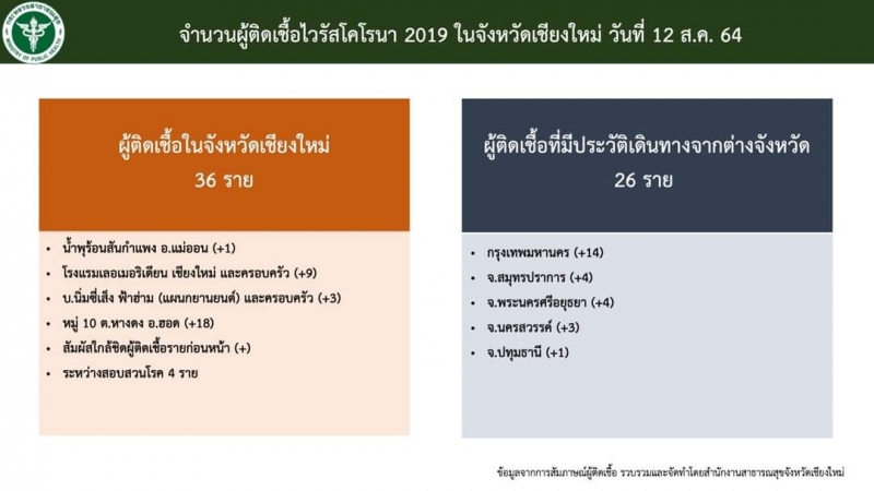 ผู้ติดเชื้อรายใหม่ 62 รายในวันนี้ เป็นผู้ติดเชื้อที่เดินทางมาจากต่างจังหวัด จำนวน 26 ราย โดยมาจากกรุงเทพมหานครมากที่สุด 14 ราย รองลงมาคือสมุทรปราการ 4 ราย อยุธยา 4 ราย นครสวรรค์ 3 ราย และปทุมธานี 1 ราย ส่วนอีก 32 ราย เป็นผู้ติดเชื้อในจังหวัด ซึ่งมาจากคลัสเตอร์น้ำพุร้อนสันกำแพง อำเภอแม่ออน 1 ราย คือ CM 6208 เป็นผู้สัมผัสในที่ทำงานน้ำพุร้อนสันกำแพง ตรวจครั้งที่ 2 ไม่มีผู้สัมผัสเพิ่ม รวมผู้ติดเชื้อสะสมในคลัสเตอร์นี้ 34 ราย