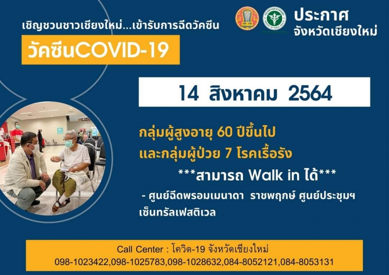 | • 14และ16สิงหา เชียงใหม่เปิด Walk in ฉีดวัคซีนโควิด-19 กลุ่มผู้สูงอายุและผู้ป่วย 7 โรคเรื้อรัง |