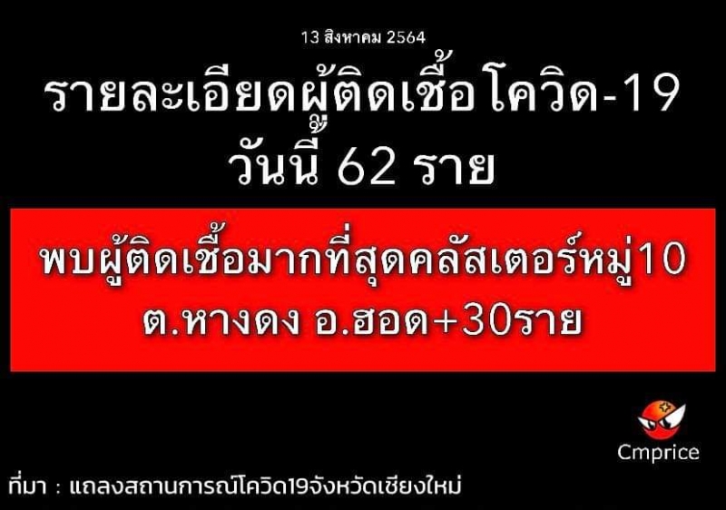 คลัสเตอร์ตำบลหางดง อำเภอฮอด วันนี้พบผู้ติดเชื้อเพิ่ม 30 ราย เป็นการติดเชื้อกระจายไปยังผู้สัมผัสร่วมชุมชน โดยเด็กที่เล่นฟุตบอลด้วยกัน รวมทั้งเจ้าของร้านโกข้าวมันไก่ และพนักงานอีก 2 คนในหมู่ที่ 2 ตำบลหางดง รวมคลัสเตอร์นี้มีผู้ติดเชื้อสะสมทั้งหมด 57 ราย จึงขอประกาศให้ผู้เข้าใช้บริการร้านโกข้าวมันไก่และร้านขายน้ำหวาน (หน้าร้านโกข้าวมันไก่) ระหว่างวันที่ 31 กรกฎาคม -12 สิงหาคม 2564 ให้กักตัวสังเกตอาการ หากมีอาการผิดปกติให้เข้ารับการตรวจหาเชื้อ พร้อมกักตัวเอง 14 วัน