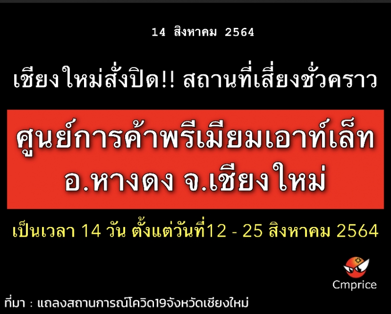 คณะกรรมการโรคติดต่อจังหวัดเชียงใหม่ สั่งปิดศูนย์การค้าพรีเมี่ยมเอาท์เล็ท เชียงใหม่ (Premium Outlet Chiang Mai) พร้อมทั้งให้พนักงานเข้ารับการตรวจคัดกรองหาเชื้อโควิด-19
