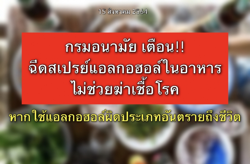 | • กรมอนามัย เตือน!! ฉีดสเปรย์แอลกอฮอล์ในอาหาร ไม่ช่วยฆ่าเชื้อโรค |