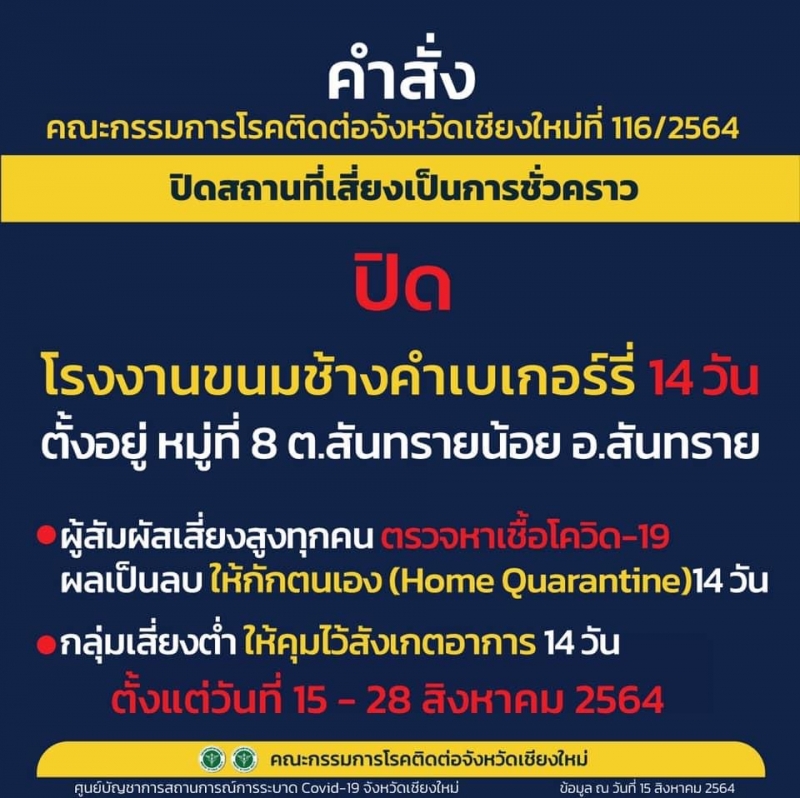 วันนี้ (15 ส.ค. 64) ที่ศูนย์บัญชาการสถานการณ์การระบาดโรค Covid-19 จังหวัดเชียงใหม่ นายกนก ศรีวิชัยนันท์ ปลัดจังหวัดเชียงใหม่ เปิดเผยว่า จากที่เกิดการแพร่ระบาดของโรคติดเชื้อโควิด-19 ในลักษณะกลุ่มก้อน ในพื้นที่โรงงานขนมช้างคำเบเกอร์รี่ ตั้งอยู่เลขที่ 4 หมู่ที่ 8 ตำบลสันทรายน้อย อำเภอสันทราย จังหวัดเชียงใหม่ และจากการตรวจหาเชื้อเชิงรุก พบว่ามีการกระจายไปยังพื้นที่อื่น ดังนั้นเพื่อเป็นการเฝ้าระวังป้องกันโรคติดเชื้อโควิด-19 ในพื้นที่อำเภอสันทราย คณะกรรมการโรคติดต่อจังหวัดเชียงใหม่ จึงมีมติออกคำสั่งที่ 116/2564 เรื่อง ปิดสถานที่เสี่ยงเป็นการชั่วคราว โดยให้ปิดพื้นที่โรงงานขนมช้างคำเบเกอร์รี่ เป็นเวลา 14 วัน โดยให้ผู้สัมผัสเสี่ยงสูงทุกคนเข้ารับการตรวจคัดกรองหาเชื้อไวรัสโควิด-19 หากผลตรวจเป็นลบให้กักตนเอง และกลุ่มเสี่ยงต่ำให้คุมไว้สังเกตอาการ เป็นเวลา 14 วัน พร้อมทั้งให้นายอำเภอแม่แตงในฐานะหัวหน้าศูนย์ปฏิบัติการควบคุมโรคอำเภอสันทราย กำกับและควบคุมการปฏิบัติตามคำสั่งให้เป็นไปด้วยความเรียบร้อย