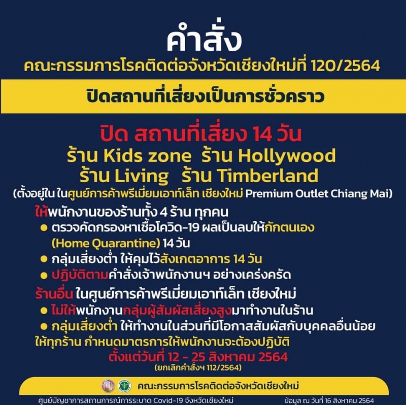 วันนี้ (16 ส.ค. 64) ที่ศูนย์บัญชาการสถานการณ์การระบาดโรค Covid-19 จังหวัดเชียงใหม่ นายกนก ศรีวิชัยนันท์ ปลัดจังหวัดเชียงใหม่ เปิดเผยว่า ตามที่คณะกรรมการโรคติดต่อจังหวัดเชียงใหม่ ได้ออกคำสั่งปิดศูนย์การค้าพรีเมี่ยมเอาท์เล็ท เชียงใหม่ (Premium Outlet Chiang Mai) ซึ่งตั้งอยู่เลขที่ 888 ซอยบ้านช่างคำหลวง 13 หมู่ที่ 5 ตำบลบ้านแหวน อำเภอหางดง จังหวัดเชียงใหม่ เป็นเวลา 14 วัน หลังจากพบผู้ติดเชื้อโตวิด-19 นั้น ขณะนี้จากการสอบสวนโรค ไม่พบการติดเชื้อในกลุ่มผู้สัมผัสเสี่ยงสูงเพิ่มเติม จึงอนุญาตให้เปิดร้านอื่น ๆ ในศูนย์การค้าพรีเมี่ยมเอาท์เล็ท เชียงใหม่ ให้สามารถเปิดทำการได้ตามปกติ ยกเว้นร้าน Kids zone, ร้าน Hollywood, ร้าน Living และร้าน Timberland ที่ยังคงให้ปิดทำการต่อไป จนถึงวันที่ 25 สิงหาคม 2564 เพื่อเป็นการผ่อนคลายทางเศรษฐกิจ และควบคุมโรคให้เป็นไปอย่างมีประสิทธิภาพ