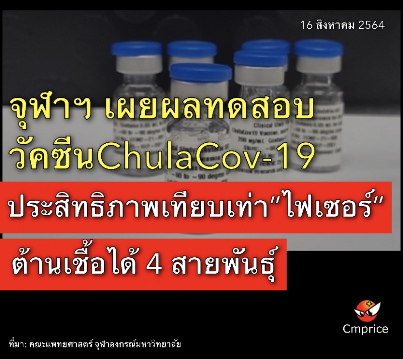 | • จุฬาฯ เผยผลทดสอบวัคซีน ChulaCov-19 ประสิทธิภาพเทียบเท่าไฟเซอร์ต้านเชื้อได้ 4 สายพันธุ์ คาดได้ใช้ในปีหน้า |
