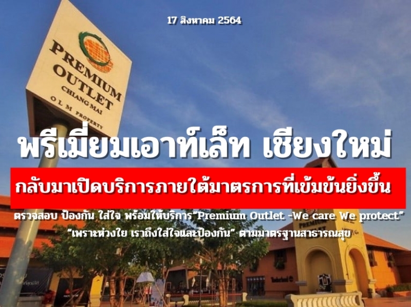 17 สิงหาคม 2564 พรีเมี่ยมเอาท์เล็ท เชียงใหม่ กลับมาเปิดบริการภายใต้มาตรการที่เข้มข้นยิ่งขึ้น ตรวจสอบ ป้องกัน ใส่ใจ พร้อมให้บริการ “Premium Outlet - We care We protect” “เพราะห่วงใย เราถึงใส่ใจและป้องกัน” ตามมาตรฐานสาธารณสุข ย้ำเพื่อความมั่นใจของลูกค้า